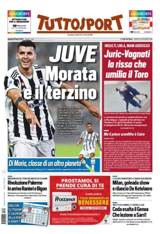La redazione di calciocrotone.it propone ai lettori le prime pagine dei tre quotidiani sportivi in edicola oggi, giovedì 28 luglio 2022. Di seguito le prime di La Gazzetta dello Sport, Corriere dello Sport e Tuttosport. Buona visione.