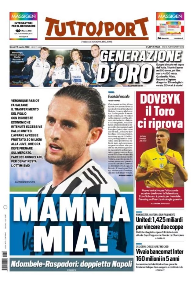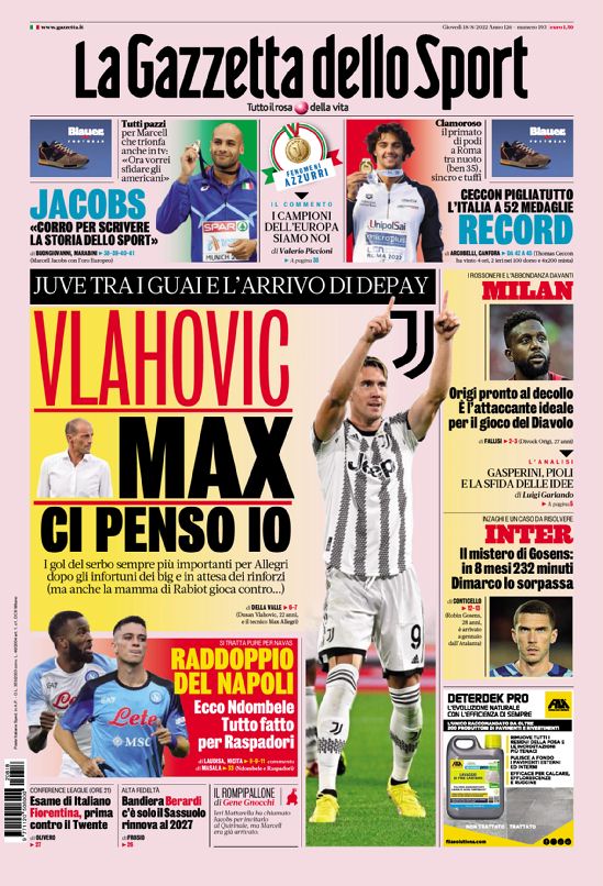 La redazione di calciocrotone.it propone ai lettori le prime pagine dei tre quotidiani sportivi in edicola oggi, giovedì 18 agosto 2022. Di seguito le prime di La Gazzetta dello Sport, Corriere dello Sport e TuttoSport. Buona visione.