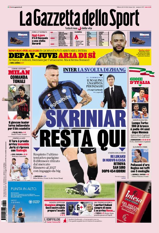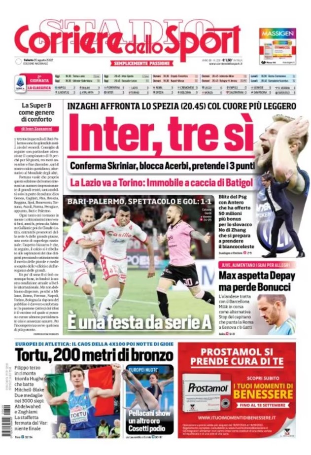 La redazione di calciocrotone.it propone ai lettori le prime pagine dei tre quotidiani sportivi in edicola oggi, sabato 20 agosto 2022. Di seguito le prime di La Gazzetta dello Sport, Corriere dello Sport e TuttoSport. Buona visione.
