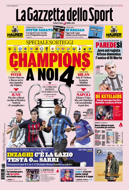 La redazione di calciocrotone.it propone ai lettori le prime pagine dei tre quotidiani sportivi in edicola oggi, venerdì 26 agosto 2022. Di seguito le prime di La Gazzetta dello Sport, Corriere dello Sport e TuttoSport. Buona visione.