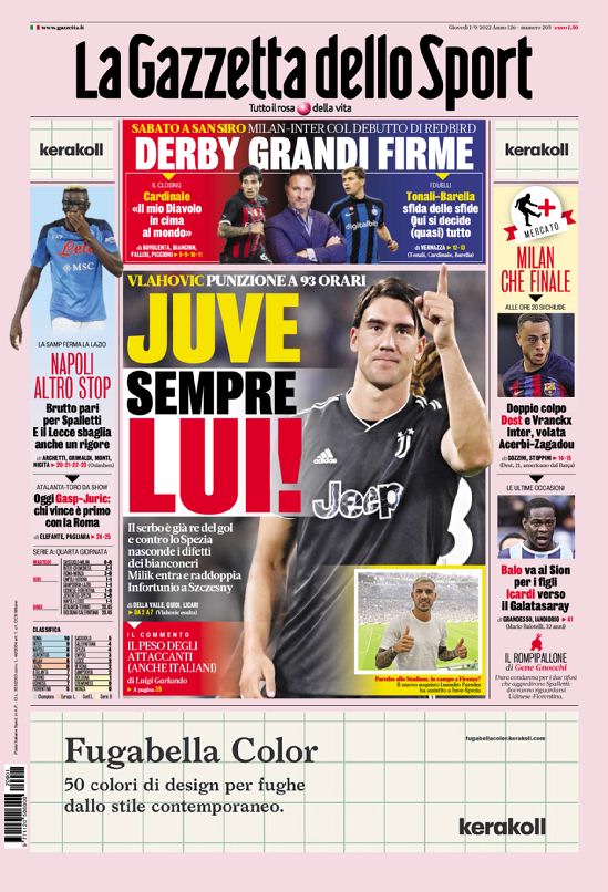 La redazione di calciocrotone.it propone ai lettori le prime pagine dei tre quotidiani sportivi in edicola oggi, giovedì 1 settembre 2022. Di seguito le prime di La Gazzetta dello Sport, Corriere dello Sport e TuttoSport. Buona visione.