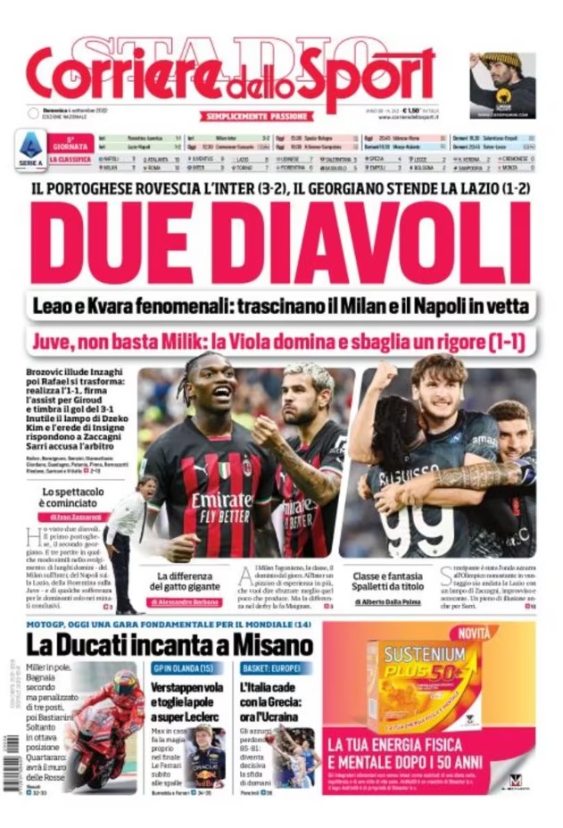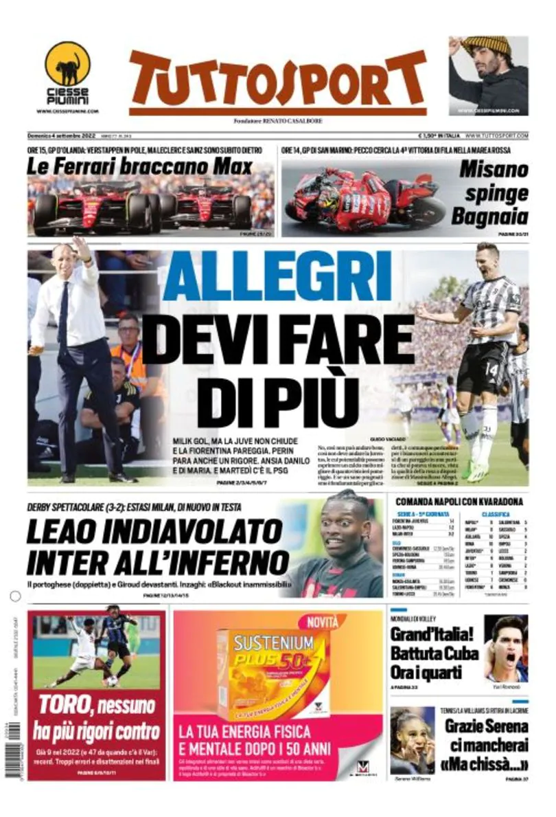 La redazione di calciocrotone.it propone ai lettori le prime pagine dei tre quotidiani sportivi in edicola oggi, domenica 4 settembre 2022. Di seguito le prime di La Gazzetta dello Sport, Corriere dello Sport e TuttoSport. Buona visione.