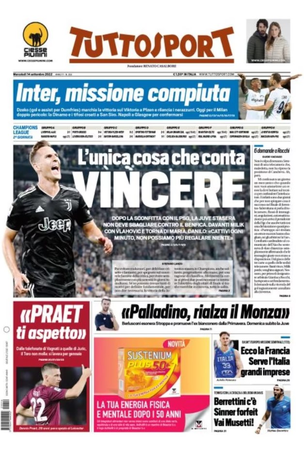 La redazione di calciocrotone.it propone ai lettori le prime pagine dei tre quotidiani sportivi in edicola oggi, mercoledì 14 settembre 2022. Di seguito le prime di La Gazzetta dello Sport, Corriere dello Sport e TuttoSport. Buona visione.