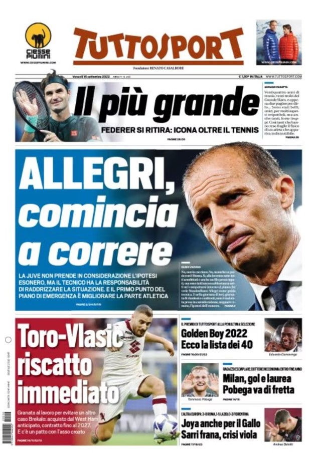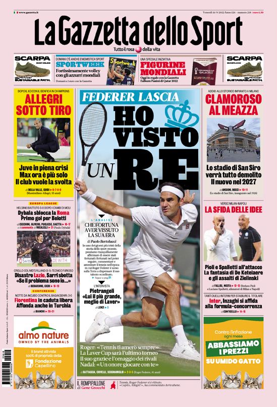 La redazione di calciocrotone.it propone ai lettori le prime pagine dei tre quotidiani sportivi in edicola oggi, venerdì 16 settembre 2022. Di seguito le prime di La Gazzetta dello Sport, Corriere dello Sport e TuttoSport. Buona visione.