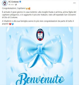 Il club rossoblù aggiunge: “È arrivato il gran giorno in casa Golemic: alla moglie Duda e ad Ema, prima figlia del capitano pitagorico, si è aggiunto il piccolo Vukasin, nato all’ospedale San Giovanni di Dio di Crotone. A Vladimir e alla sua famiglia vanno le più vive congratulazioni da parte di tutto il popolo rossoblù”.