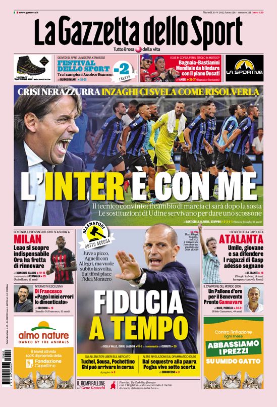 La redazione di calciocrotone.it propone ai lettori le prime pagine dei tre quotidiani sportivi in edicola oggi, martedì 20 settembre 2022. Di seguito le prime di La Gazzetta dello Sport, Corriere dello Sport e TuttoSport. Buona visione.