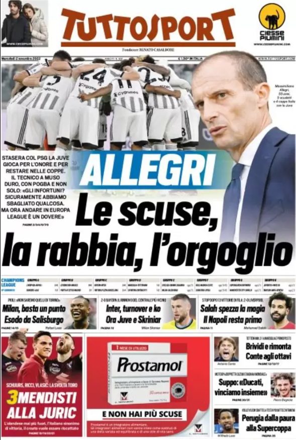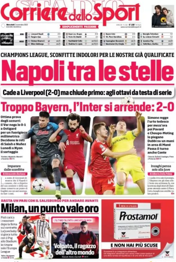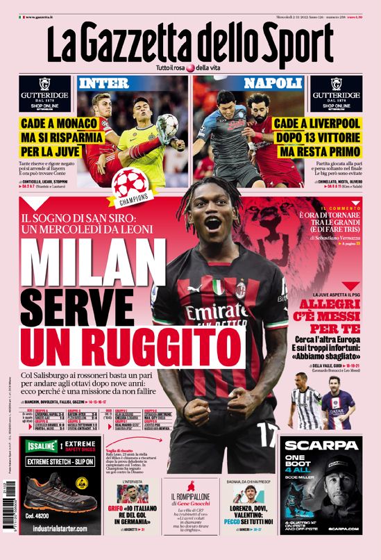La redazione di calciocrotone.it propone ai lettori le prime pagine dei tre quotidiani sportivi in edicola oggi, mercoledì 2 novembre 2022. Di seguito le prime di La Gazzetta dello Sport, Corriere dello Sport e TuttoSport. Buona visione.