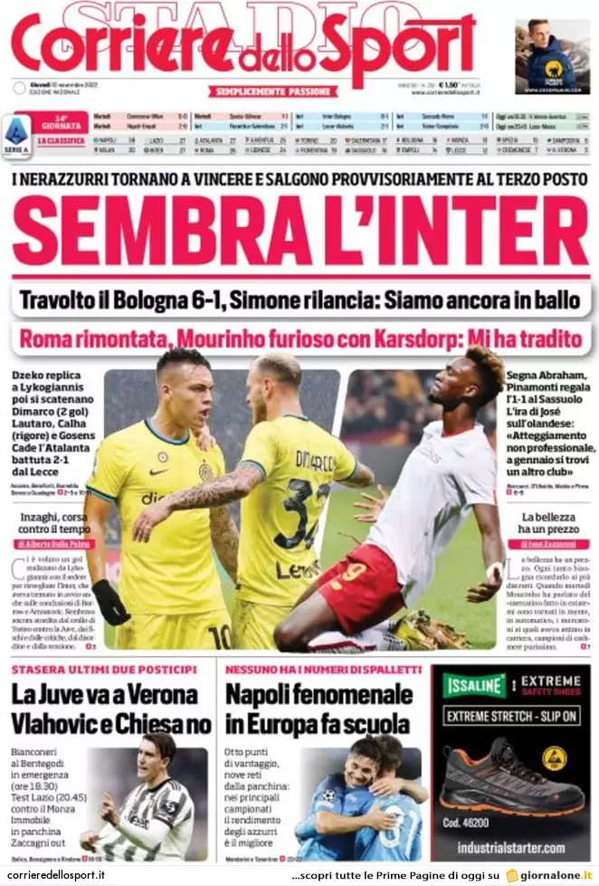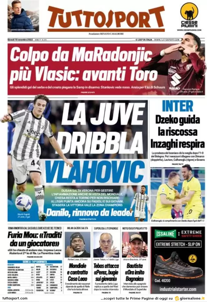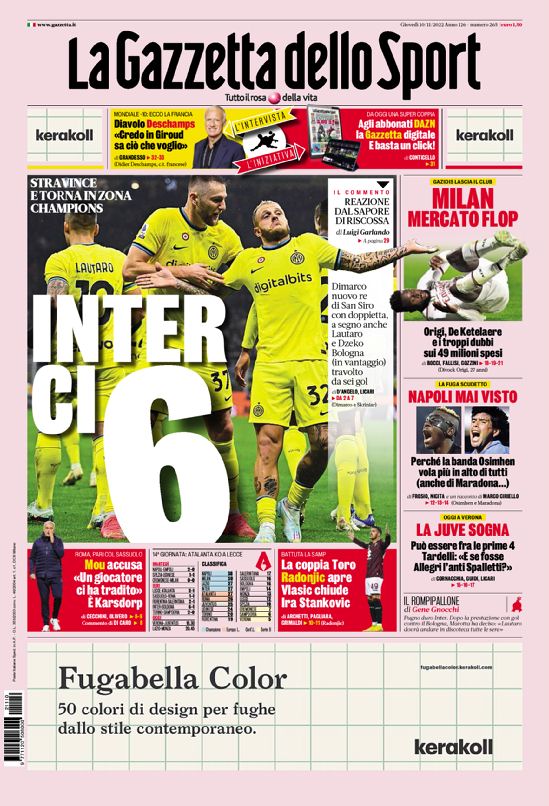 La redazione di calciocrotone.it propone ai lettori le prime pagine dei tre quotidiani sportivi in edicola oggi, giovedì 10 novembre 2022. Di seguito le prime di La Gazzetta dello Sport, Corriere dello Sport e TuttoSport. Buona visione.