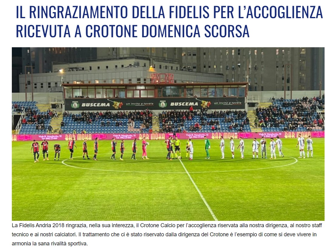 “La Fidelis Andria 2018 ringrazia, nella sua interezza, il Crotone Calcio per l’accoglienza riservata alla nostra dirigenza, al nostro staff tecnico e ai nostri calciatori. Il trattamento che ci è stato riservato dalla dirigenza del Crotone è l’esempio di come si deve vivere in armonia la sana rivalità sportiva”.