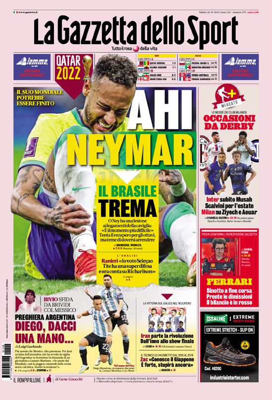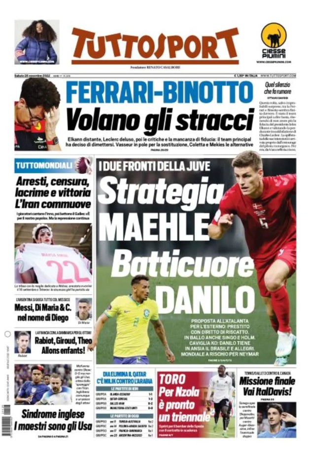 La redazione di calciocrotone.it propone ai lettori le prime pagine dei tre quotidiani sportivi in edicola oggi, sabato 26 novembre 2022. Di seguito le prime di La Gazzetta dello Sport, Corriere dello Sport e TuttoSport. Buona visione.