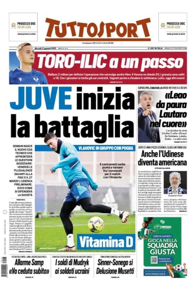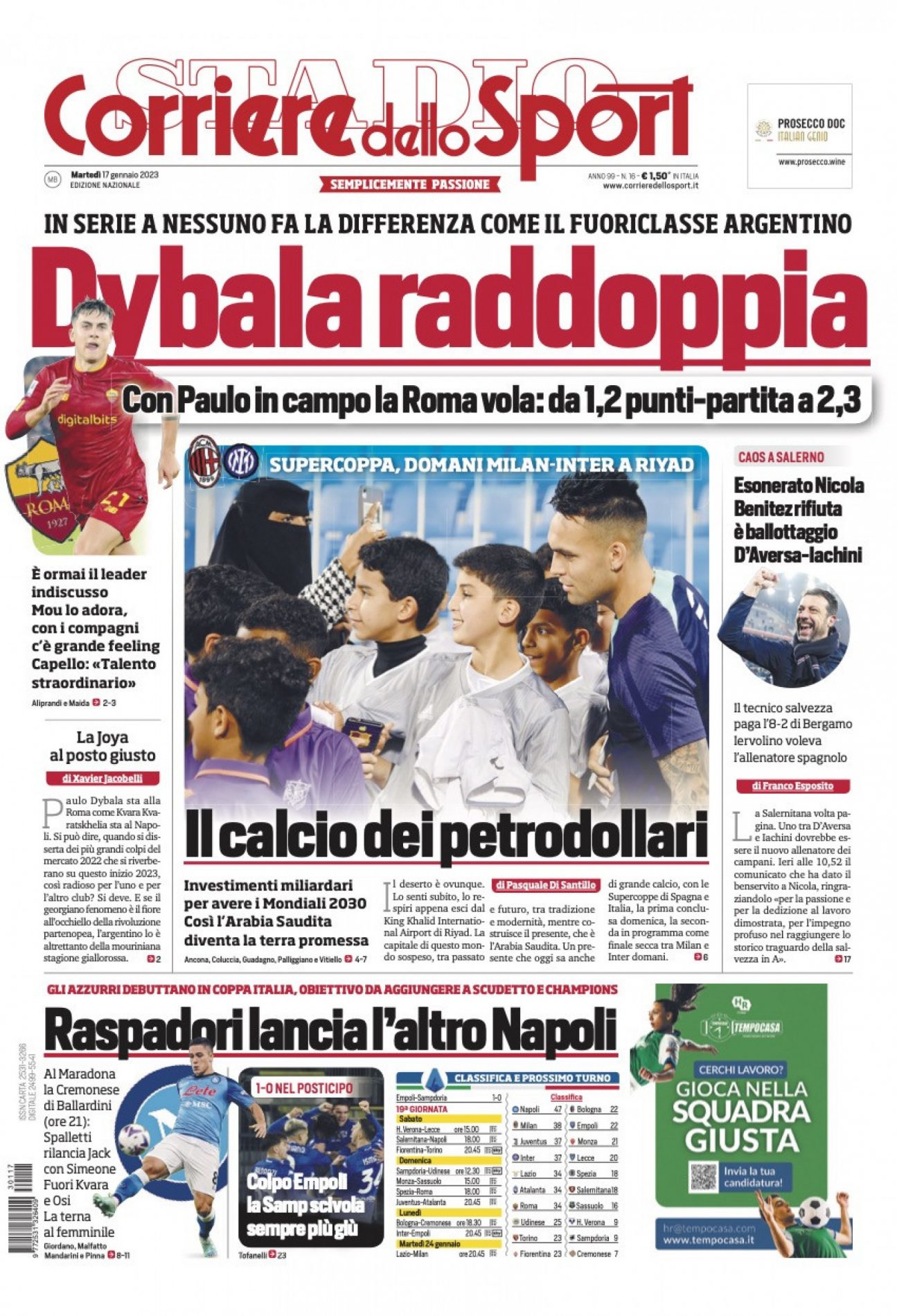 La redazione di calciocrotone.it propone ai lettori le prime pagine dei tre quotidiani sportivi in edicola oggi, martedì 17 gennaio 2023. Di seguito le prime di La Gazzetta dello Sport, Corriere dello Sport e TuttoSport. Buona visione.