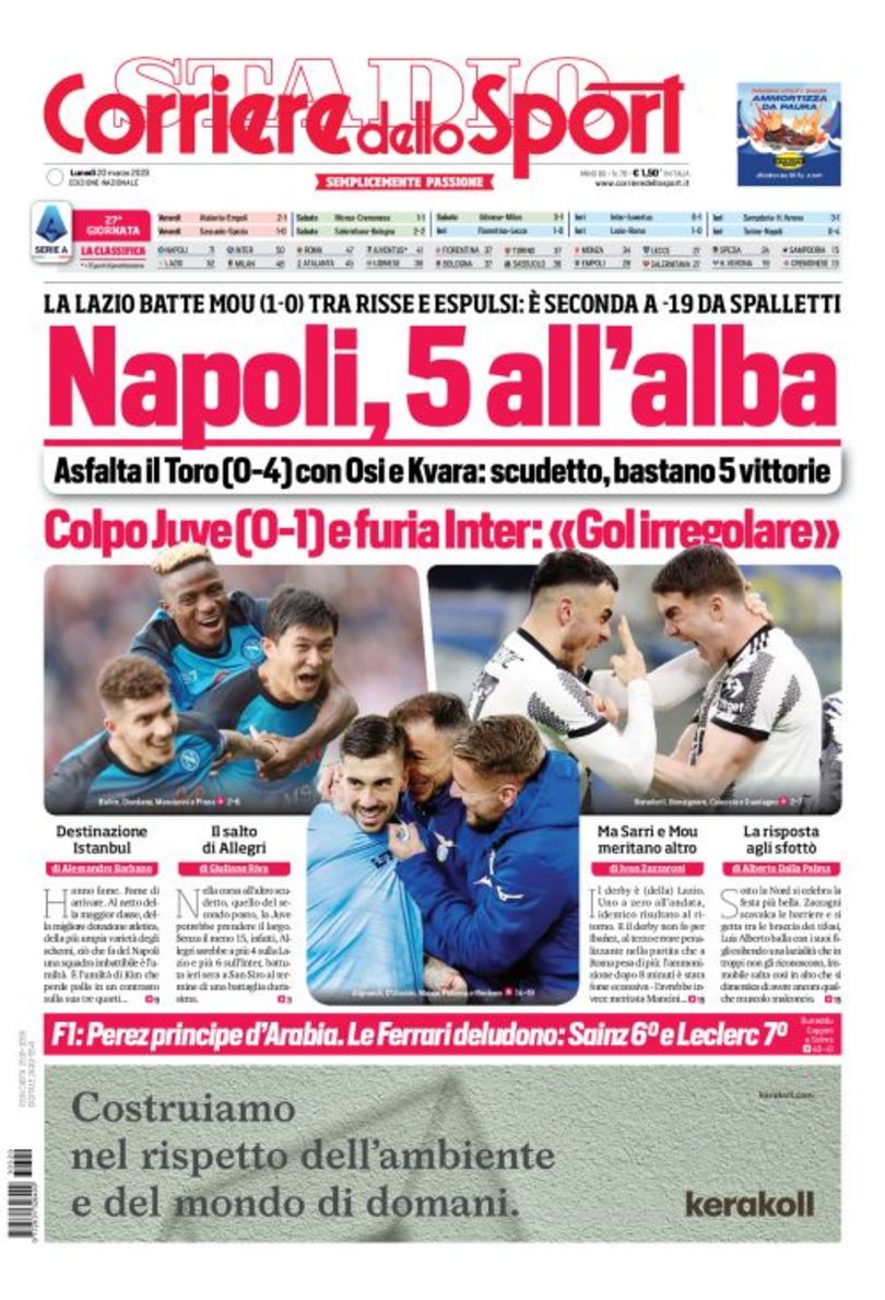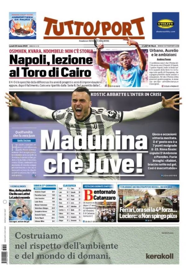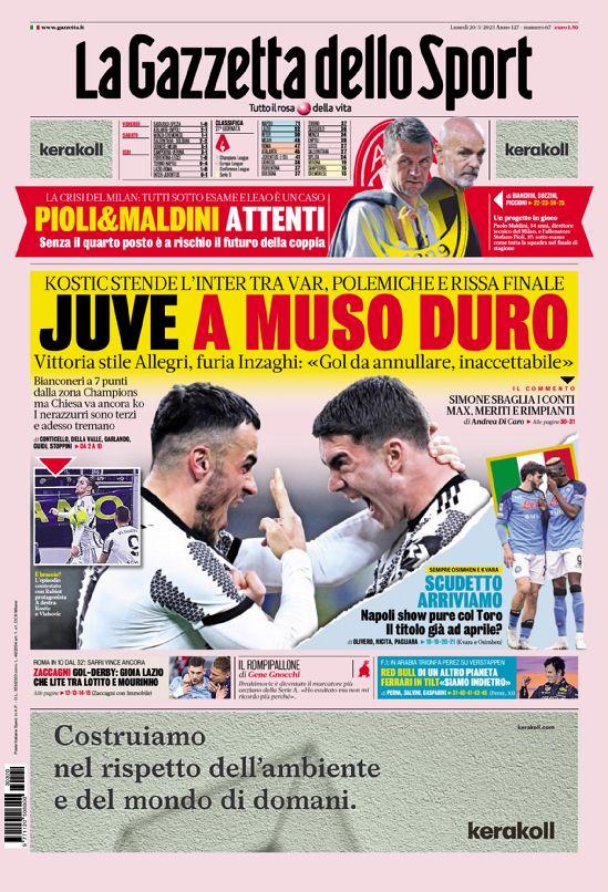 La redazione di calciocrotone.it propone ai lettori le prime pagine dei tre quotidiani sportivi in edicola oggi, lunedì 20 marzo 2023. Di seguito le prime di La Gazzetta dello Sport, Corriere dello Sport e TuttoSport. Buona visione.