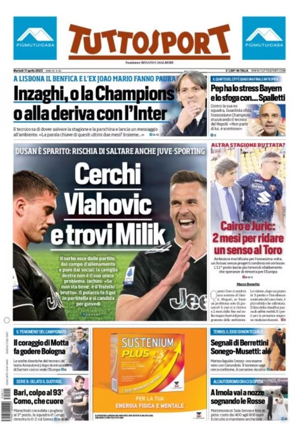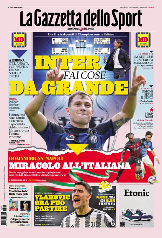 La redazione di calciocrotone.it propone ai lettori le prime pagine dei tre quotidiani sportivi in edicola oggi, martedì 11 aprile 2023. Di seguito le prime di La Gazzetta dello Sport, Corriere dello Sport e TuttoSport. Buona visione.