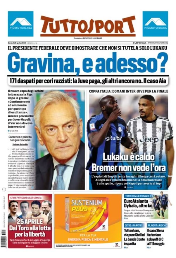 La redazione di calciocrotone.it propone ai lettori le prime pagine dei tre quotidiani sportivi in edicola oggi, martedì 25 aprile 2023. Di seguito le prime di La Gazzetta dello Sport, Corriere dello Sport e TuttoSport. Buona visione.