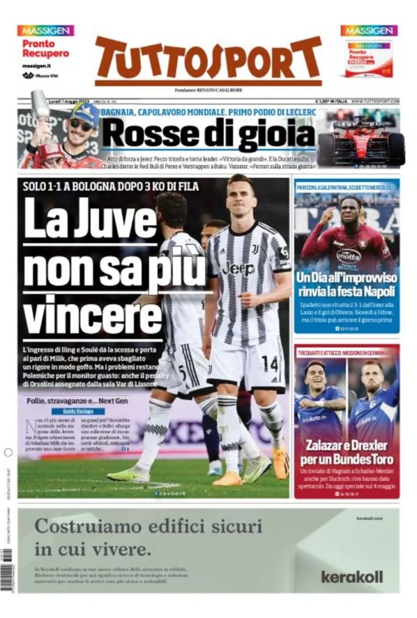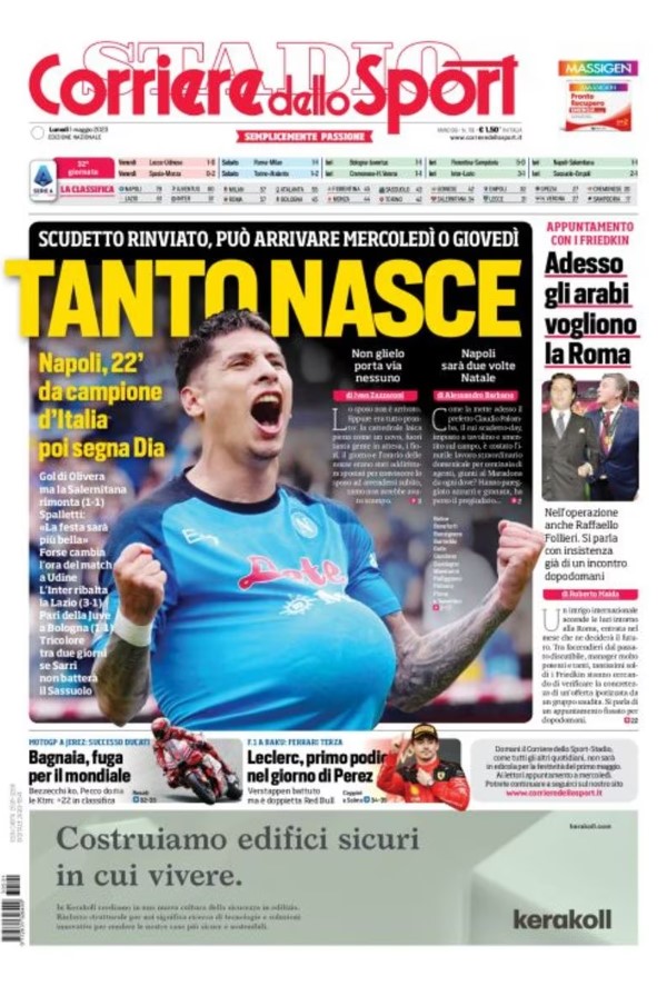 La redazione di calciocrotone.it propone ai lettori le prime pagine dei tre quotidiani sportivi in edicola oggi, lunedì 1 maggio 2023. Di seguito le prime di La Gazzetta dello Sport, Corriere dello Sport e TuttoSport. Buona visione.