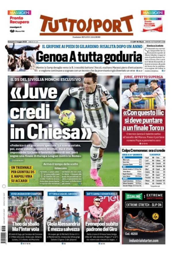 La redazione di calciocrotone.it propone ai lettori le prime pagine dei tre quotidiani sportivi in edicola oggi, domenica 7 maggio 2023. Di seguito le prime di La Gazzetta dello Sport, Corriere dello Sport e TuttoSport. Buona visione.