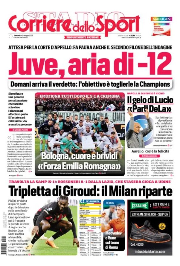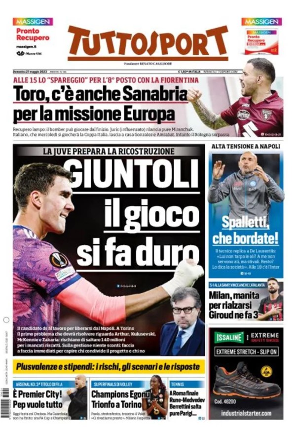 La redazione di calciocrotone.it propone ai lettori le prime pagine dei tre quotidiani sportivi in edicola oggi, domenica 21 maggio 2023. Di seguito le prime di La Gazzetta dello Sport, Corriere dello Sport e TuttoSport. Buona visione.