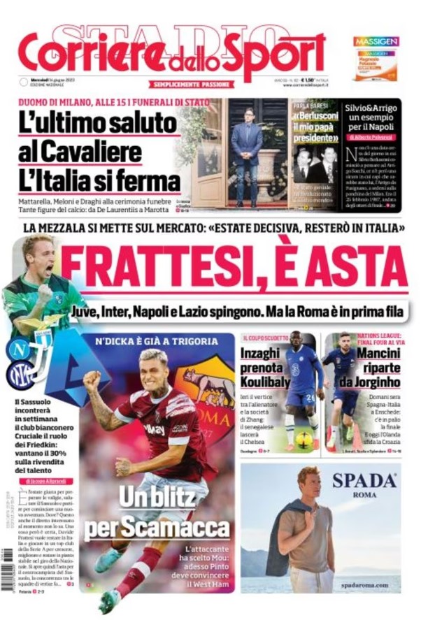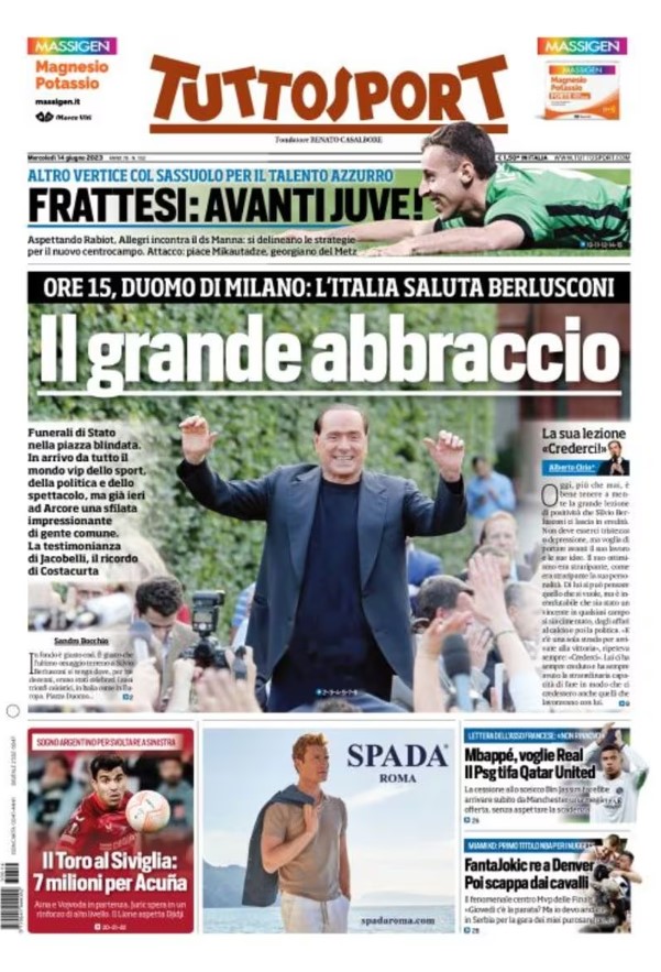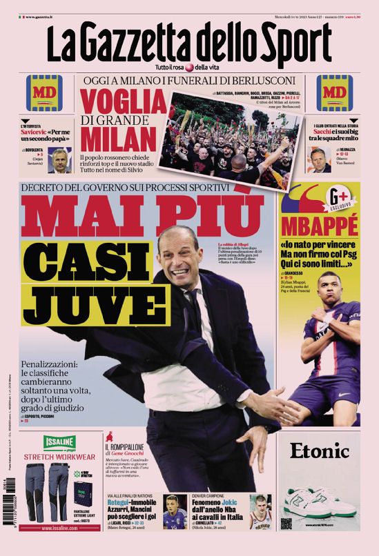 La redazione di calciocrotone.it propone ai lettori le prime pagine dei tre quotidiani sportivi in edicola oggi, mercoledì 14 giugno 2023. Di seguito le prime di La Gazzetta dello Sport, Corriere dello Sport e TuttoSport. Buona visione.
