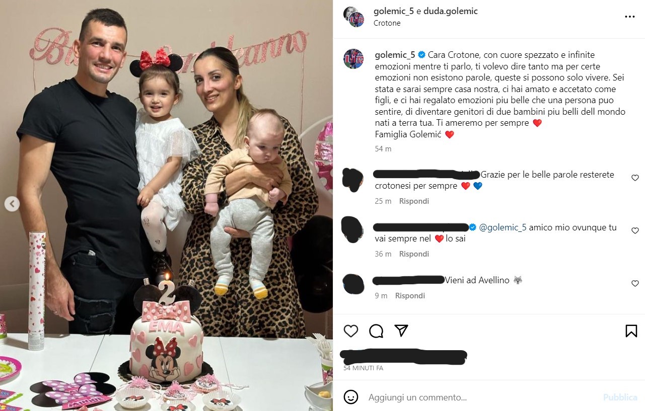 “Cara Crotone, con cuore spezzato e infinite emozioni mentre ti parlo, ti volevo dire tanto ma per certe emozioni non esistono parole, queste si possono solo vivere. Sei stata e sarai sempre casa nostra, ci hai amato e accetato come figli, e ci hai regalato emozioni piu belle che una persona puo sentire, di diventare genitori di due bambini piu belli dell mondo nati a terra tua. Ti ameremo per sempre. Famiglia Golemić”.