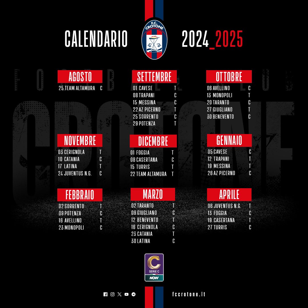 Il 25 agosto, in attesa del calendario definitivo con anticipi, posticipi e orari, il Crotone debuterrĆ nel campionato Serie C Now 2024-2025. La squadra di Emilio Longo comincerĆ allo stadio Ezio Scida, avversario sarĆ la neopromossa Altamura. A settembre, invece, sono in programma ben sei incontri. Si comincia in trasferta con un’altra neopromossa, la Cavese. Quindi la doppia in casa con Trapani, terza neopromossa di fila, e Messina. Quindi l’alternza trasferta (Picerno, il ritorno di Longo a “casa”), casa (Sorrento) e trasferta (Potenza).